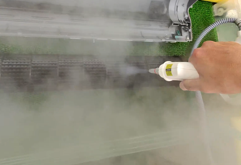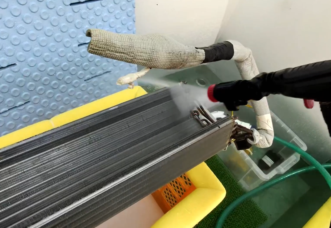 ファンは無数の羽が角度をつけて作られているため、非常に洗浄しいにくい形状になっており、高圧洗浄機を使用したりブラシでこすりますが、汚れが残っている可能性を考え、最後に高温スチームでカビ菌を除菌して仕上げます。
